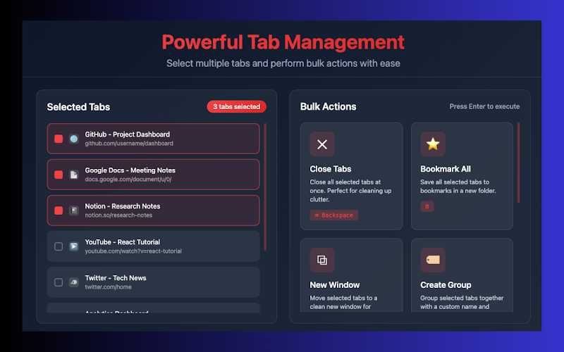 • Instant Universal Search: Find open tabs, bookmarks, and browser history with lightning-fast fuzzy matching (even with typos). • Tab Management & Groups: Use /groups to organize your workspace or /autogroup to sort tabs by domain instantly. • Quick Notes: Type /note to capture ideas without leaving your current page. • Reading List: Save any article with ⌘+Shift+S and access it later with /read. • Workspaces: Save and restore entire tab sessions for different projects using /save. • Clipboard History: Access your recently copied links and text using /clip.